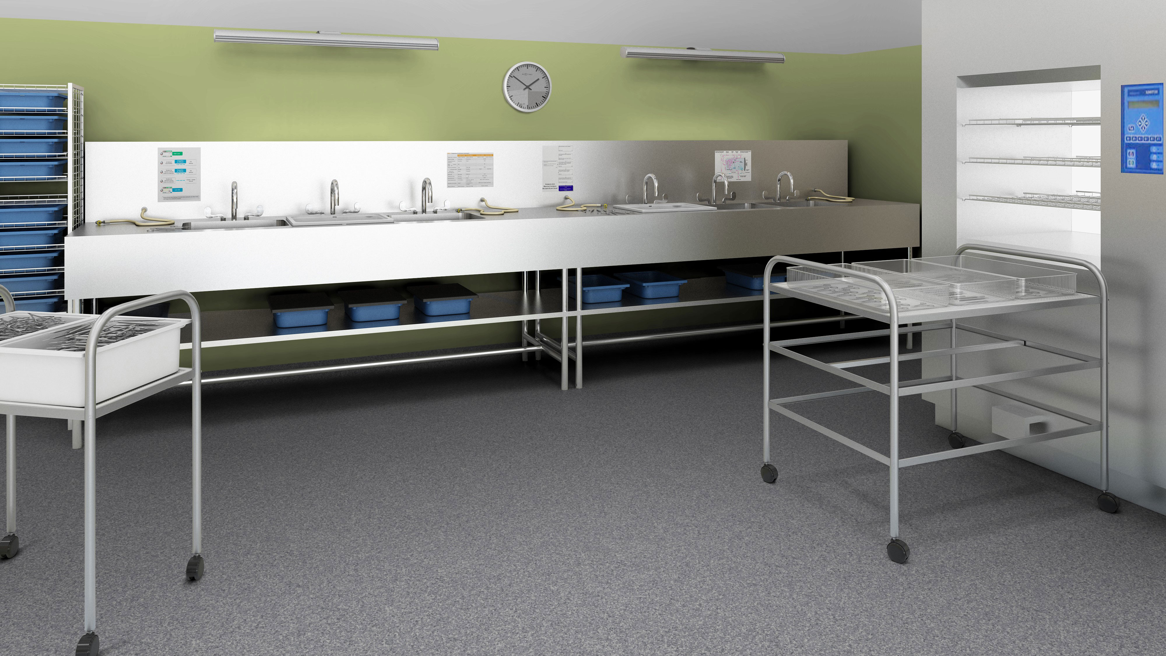 Der stetige Kontakt mit unterschiedlichsten Reinigungs- und Desinfektionsmitteln sowie stark reagierenden Chemikalien und der Umgang mit schweren Rollelementen beanspruchen die Oberflächen besonders stark. Antibakterielle Beläge sind hier eine sehr gute Maßnahme, außerdem muss eine möglichst fugenlose Verlegung gewährleistet werden, um einerseits keine versteckten Areale für Keime und Erreger zu bieten und andererseits ein problemloses Bewegen von Rollelementen zu sichern.